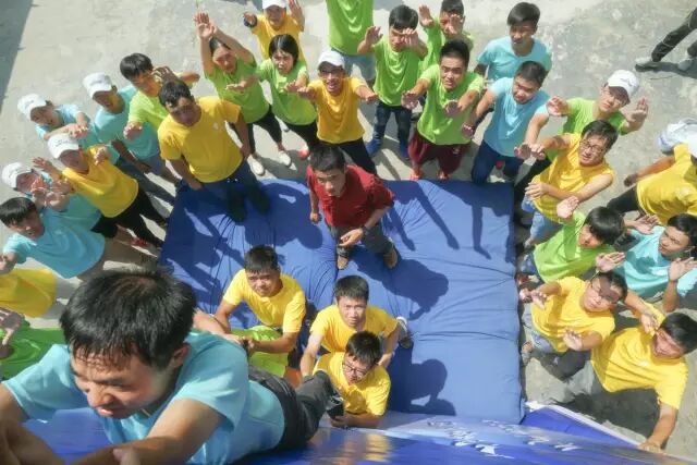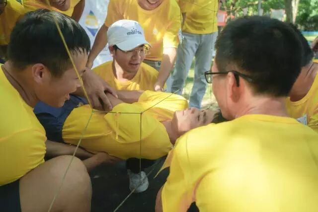 简单的说生死电网就是让我们队伍在40分钟的时间内想办法让所有人穿过一个可能只有每个人腰部宽大小的洞,洞口的数量有限而且身体不能触碰到洞,一旦违规就会失去一个有效洞口。一开始大家计划好开始行动时便损失了一个洞,而且我们队伍大部分男同事的块头都比较大,看到这情形我开始觉得这是不可能完成的事,因为我是队伍中最瘦的,尽管如此我找个中等大小的洞自己穿过去也不太可能。但是大家一致讨论后找到了方法是先找体格中等的人从大洞过去,然后其他人横着被抬过去。大家也就开始以试一试的心态开始行动,我们田队长被“抬”过去了,我从最小的洞被“抬”过去了,有人用江湖失传已久的缩骨功成功穿过了比自己肩膀窄的洞……我们最担心的大块头的同事都被我们小心翼翼护着,坚持着“抬”过去了,最后一个同事在进行两次尝试并在我们的帮助下也成功穿越了“电网”,在规定的时间内我们成功完成了这个游戏。现在想起来还好一开始我们没有放弃并坚持了下来,是所有人一起配合才让这个不可能的任务变成可能!